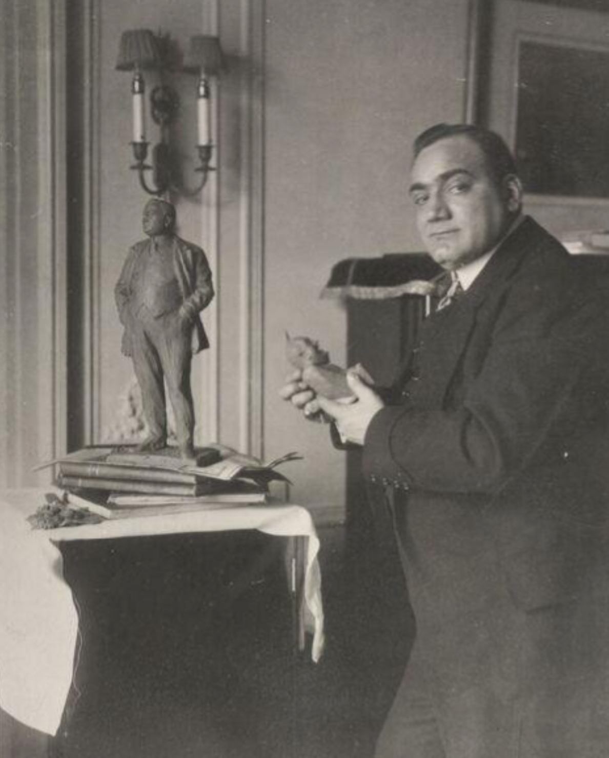 Beyond his musical career, Caruso was an accomplished draftsman and caricaturist. His sketches were regularly published in the Italian American satirical newspaper La Follia di New York and a collection of his drawings appeared in book form in 1908. The present sculpture was believed to have been made by Caruso for his friend and prominent conductor Arturo Toscanini in 1909. It has been suggested that a very small number of casts were produced from the model, though we have not been able to independently confirm this. An example of this work in identical dimensions and patination also cast by the Roman Bronze Works foundry of New York is preserved in the collection of the Victoria and Albert Museum in London along with a photograph (see images) of Caruso holding the model in his hands.